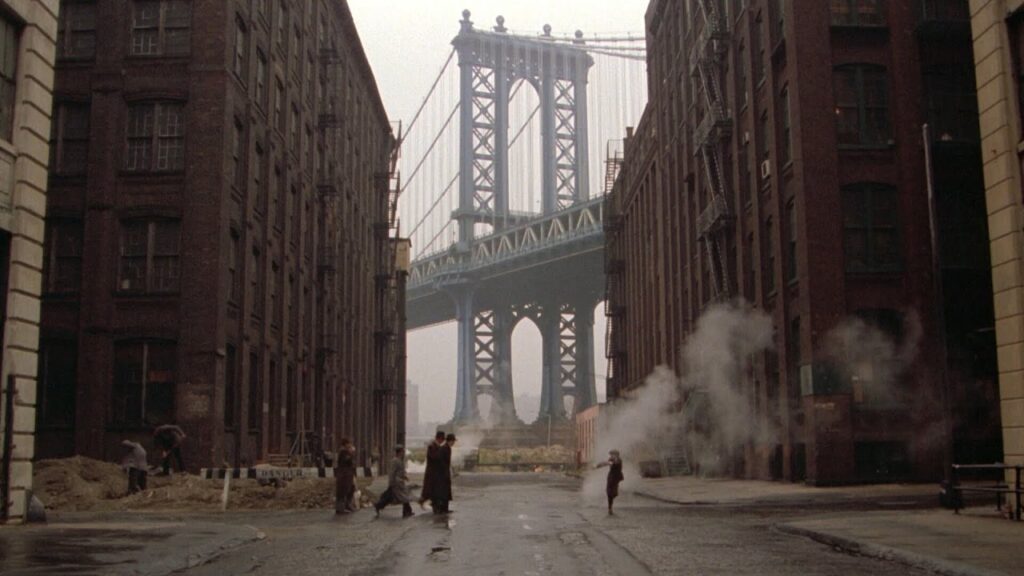 Die gewetenswroeging wordt subliem weergegeven aan de hand van aanhoudend telefoongerinkel in de eerste scènes, een typisch Leone-procedé (denk aan het bijna gekmakende gepiep van de windmolen in die fabelachtige eerste scène van Once Upon a Time in the West): na een tijdje blijkt dat Noodles zich in een opiumtent heeft teruggetrokken om te vluchten van de werkelijkheid (zijn drie vrienden zijn door zijn schuld dood, denkt hij) en dat het gerinkel dus mentaal gerinkel is, de herinnering aan het fatale moment dat hij grijpt naar de telefoon om de politie op zijn drie vrienden te attenderen (wat een sfeerschepping in die scène, vooral via de muziek van het Chinese poppentheater, die iedereen in de belendende ruimte in combinatie met de opium en de halve duisternis laat wegdoezelen). Het gerinkel zal Noodles de rest van zijn leven achtervolgen, net als het zinnetje van de jonge Dominic of de afwijzing van Deborah, de zus van Fat Moe die later hun speakeasy (clandestien café tijdens de Drooglegging) uitbaat. Al toen ze als meisje ballet oefende gluurde Noodles stiekem naar haar door een kijkgat vanuit het toilet van het café. De eerste scènes bieden de kijker een overrompelend fresco van de joodse buurt van het oude New York. Noodles en zijn vrienden lijken de verstikkende thuisomgeving (daar wordt althans door Noodles op gealludeerd) te ontvluchten door op straat te hangen en voor gangster te spelen, wat ze uiteindelijk ook echt worden. Ze slaan zo enkele stappen in de normale volwassenwording over: een aandoenlijk detail bestaat uit de te grote, lange jassen die ze aandoen bij het kuieren op straat, alsof ze grote sier maken met hun vroeg verworven mannelijkheid, tot ze een echte volwassene en gangster tegenkomen (Bugsy, gewapend met een pistool) en bang wegstuiven.