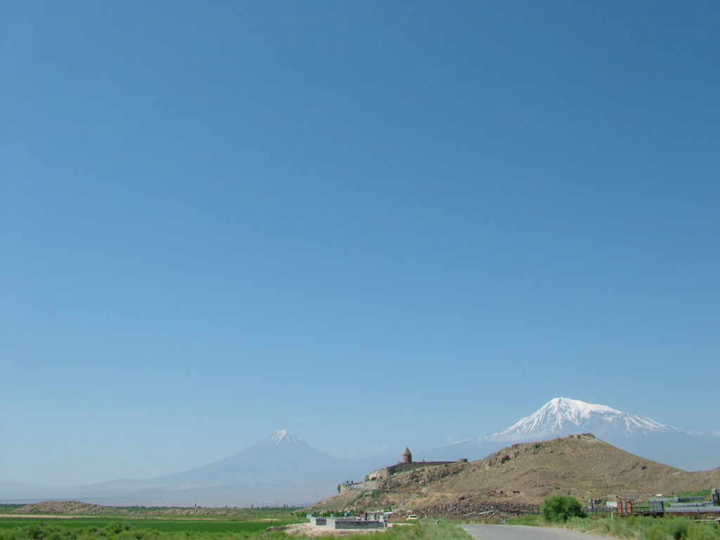 Overal rondom ons zien we tekenen van de moderne tijd en tegelijk is het onmogelijk om aan de traditie, de eeuwenoude cultuur, het verleden te ontkomen. Wanneer we Jerevan naderen moet ik weer aan Grossman denken: ‘Ik zie de Ararat, hij rijst op tegen de blauwe hemel, zacht, in tere lijnen, hij groeit als het ware uit de hemel en niet uit de aarde, als een verdichting van wolken en het blauw van de hemel.’ Ook Mandelstam bezong de Ararat in een van zijn gedichten: ‘En in Jerevan en Etsjmiadzin / Heeft de kolossale berg de lucht geheel verzwolgen, / Je zou hem moeten lokken met een ocarina / Of temmen met een fluit, zodat de sneeuw smelt in zijn muil. // En sneeuw en sneeuw en sneeuw bedekt het rijstpapier, / De berg stroomt naar mijn lippen. / Ik heb het koud. Ben blij…’. De Ararat, waarop de Ark van Noah aan het einde van de zondvloed tot stilstand kwam, is een litteken, een restant van het immense wereldrijk, van de vergane macht en glorie, een symbool van de Armeense cultuur, gelegen in het oosten van Turkije, een gebied dat volgens de Armeniërs historisch gezien aan hen toebehoort, zonder dat ze er evenwel toegang toe hebben. Toen schrijvers zoals Gorki, Mandelstam en Grossman door Armenië reisden lag de Ararat ook al in Turkije en ook toen al was de berg zowel een inspiratiebron voor poëtische expressie als een afgerukt lichaamsdeel dat onbereikbaar aan de andere kant van de rivier lag. Het is pas in Jerevan dat ik de zwaarwichtige aanwezigheid van de berg voel, de berg lijkt op wandelafstand te liggen, hij is onvermijdbaar en toch kan niemand erbij.