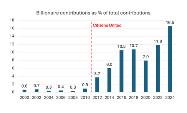Op zich zou die concentratie van rijkdom geen probleem zijn, zolang die wordt aangewend om te investeren in nieuwe technologieën en het scheppen van banen, maar als die plutocraten (en mindere rijke goden) hun rijkdom meer en meer gebruiken om de verkiezingen te beïnvloeden via giften aan de campagnes van presidentskandidaten is er wel een probleem voor de democratie.