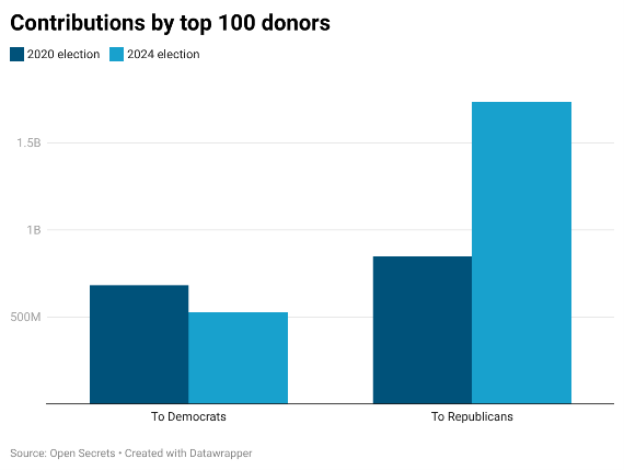 In 2010, dus lang voor Trump, heeft het Hooggerechtshof in de VS met een krappe meerderheid een wet (ruling) goedgekeurd, de zogenaamde ‘Citizens United’-wet, waardoor er geen beperking geldt voor donaties aan politieke partijen. De volgende tabel toont aan hoe dit voor plutocraten de weg heeft bereid om de politiek te beïnvloeden. Voeg daarbij het gegeven dat er sinds het aantreden van Trump de facto regels zijn die de president toestaan persoonlijke giften te aanvaarden, waardoor de invloed op de politiek nog directer en onverholen is. Uit de volgende grafiek blijkt vooreerst dat sinds 2010 de giften van de plutocraten aan de politieke partijen en de presidentscampagnes sterk toenemen. De er opvolgende grafiek (rechts) toont dat de giften vooral en steeds meer naar de Republikeinse Partij gaan, en het sterkst toenemen bij de campagne van Trump.