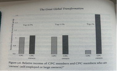 De grafiek illustreert vooral hoe de rijksten (de ‘owners’ of kapitalisten die deze naam niet mogen hebben) zijn geïnfiltreerd of gecoöpteerd in de hoogste rangen van de CPC (Communist Party of China) en gezien hun economische gewicht hebben ze een flinke vinger in de pap. De nieuwe rijken hebben in vijftig jaar niet enkel hun fortuin vergaard, maar ook hun plaats in het hoogste politiek orgaan van het land veroverd. Dit is vooral gebeurd onder de twee vorige presidenten, terwijl de machtsstrijd onder Xi Jinping juist gaat over het heroveren van de macht en de beslissingen in de CPC ten einde het gewicht van de nieuwe tycoons te temperen. Hun invloed zal groot blijven maar onder Xi wordt het politiek leiderschap van de CPC herbevestigd.